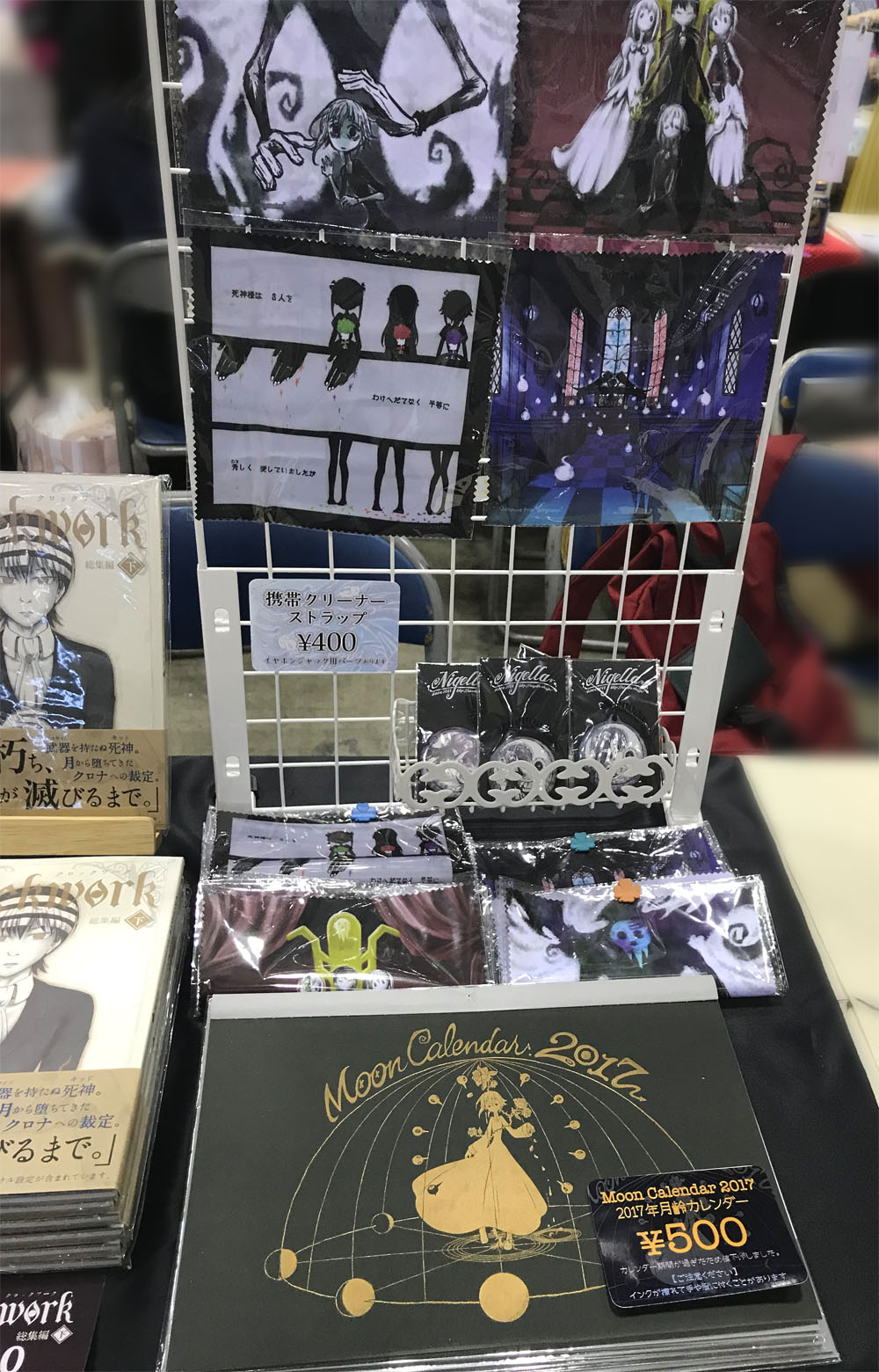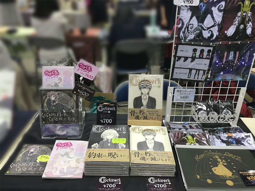 黒が多いスペースの中に1冊だけピンクの「うさくろ。」再録本が混じってるのが、ちょっとシュール(笑)