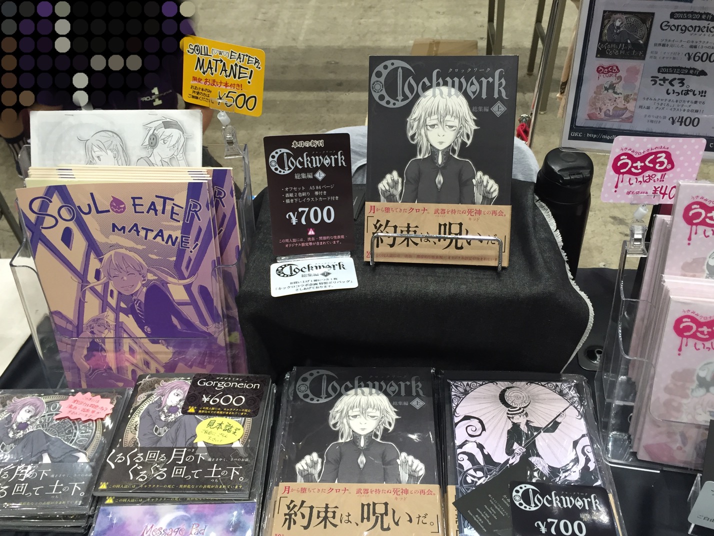 黒が多いスペースの中に1冊だけピンクの「うさくろ。」再録本が混じってるのが、ちょっとシュール(笑)